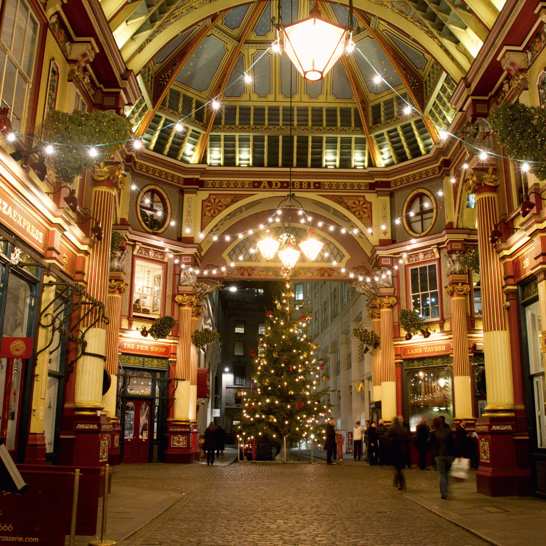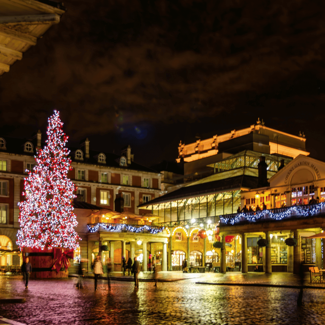 Located in the heart of London, Covent Garden becomes a key festive destination as it transforms into a vibrant Christmas setting throughout the season. The West Piazza features the iconic 55ft Christmas tree, illuminated with hundreds of lights and ideal for seasonal photos. Visitors can explore a wide range of restaurants offering special festive menus and browse hundreds of well-known brands for Christmas gift shopping. Families can also enjoy a visit to the London Transport Museum, where Santa hosts his festive shop, adding an extra highlight for children during their trip to Covent Garden.
