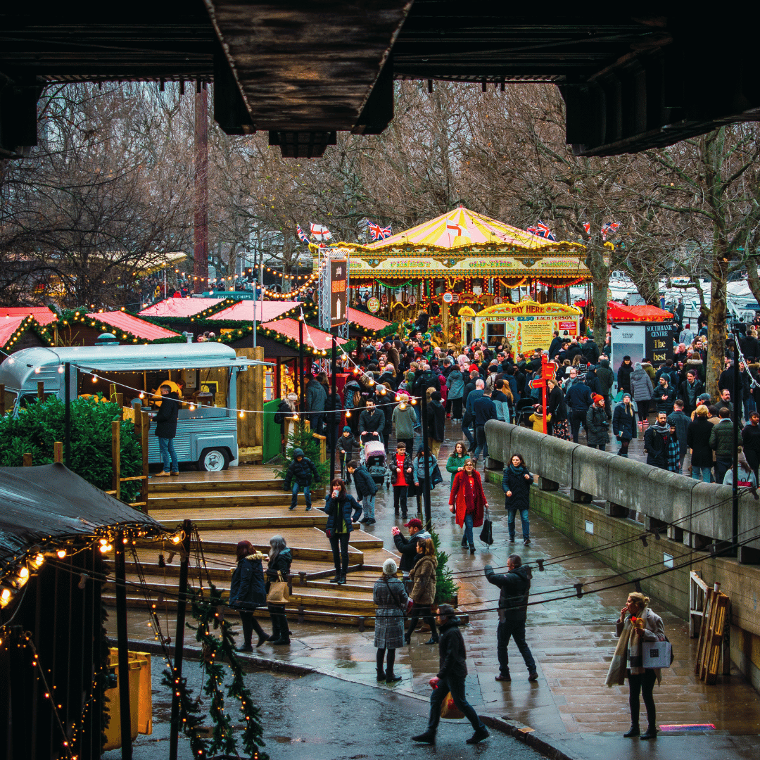 Located along the Queen’s Walk beneath Hungerford Bridge, the Southbank Winter Market offers one of London’s most popular festive experiences. The market features traditional alpine-style chalets serving indulgent seasonal drinks and a wide range of street food, making it an ideal stop for winter dining. Pop-up bars, street-food stalls, and independent craft traders line the riverside, all illuminated by twinkling lights that create a lively and atmospheric setting. Visitors can browse handmade gifts, sample festive treats, and enjoy views of the Thames, making the Southbank Winter Market a key destination for Christmas shopping and seasonal celebrations in London.